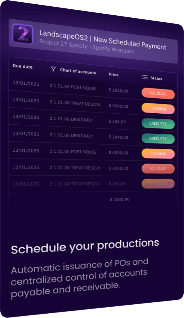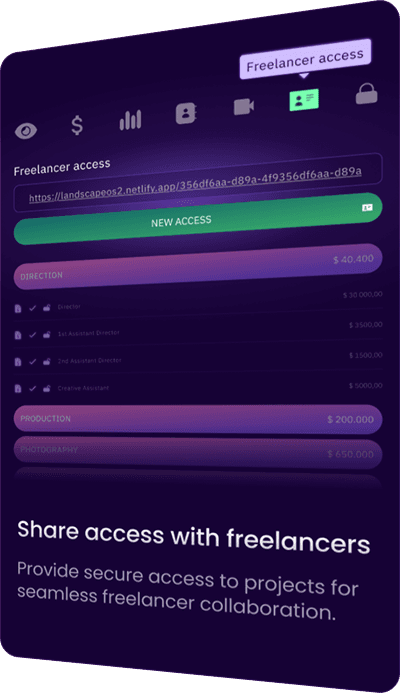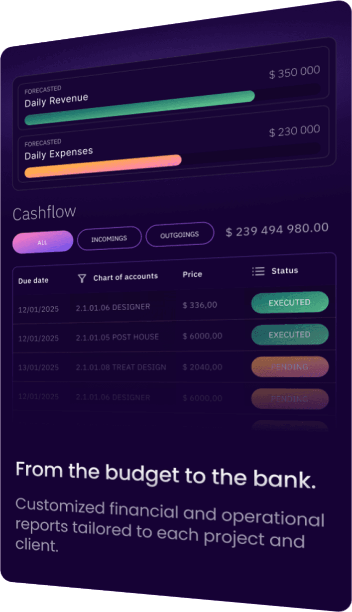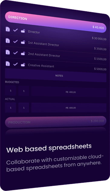 Start tracking all your productions today and compare them with your past records for better insights. Centralize all information, from budgeting to billing, reducing errors and enhancing results.